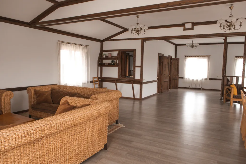 На нашей территории 12 уютных домов на выбор, есть бани, чан, спортивная и детская площадки, огород, мини-ферма, искусственный пруд, и, наконец, беседки и зона барбекю.