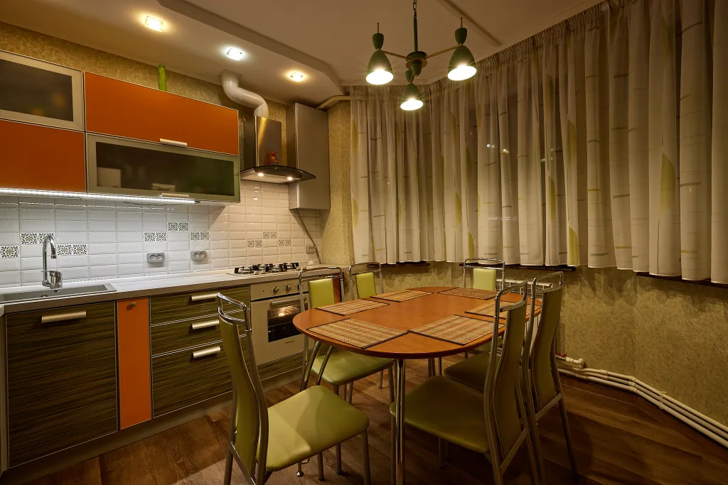 Полностью укомплектованная кухня с плитой, духовкой, микроволновкой, посудомоечной машиной, холодильником, посудой;