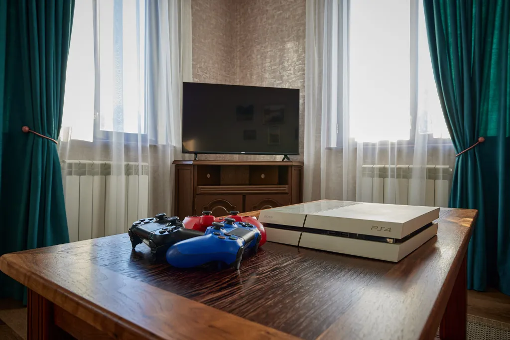 Гостиная с двуспальным диваном, обеденным столом, кондиционером, телевизором и игровой приставкой «Сони Плейстейшн»;