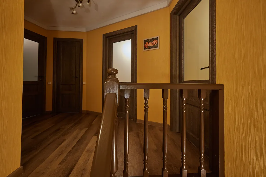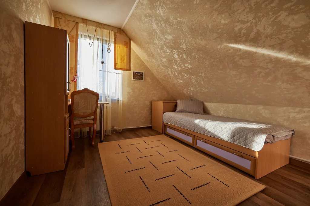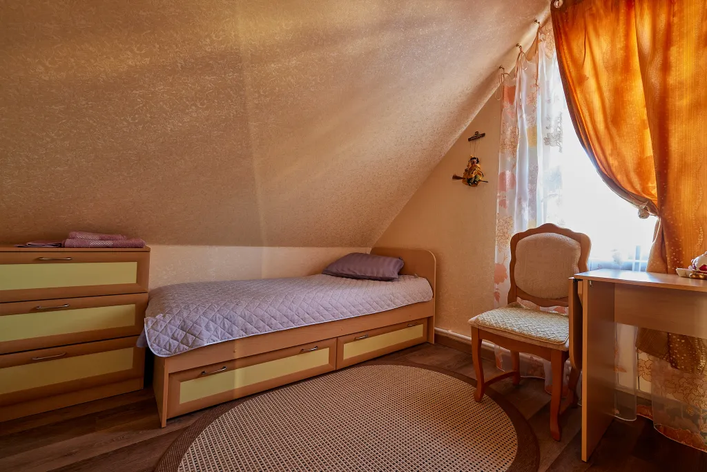 Расположен в тихом месте коттеджного поселка в 4-х километрах от Калуги, рядом озера и сосновый лес. В доме имеется пять комнат: кухня, изолированная гостиная с диваном и четыре изолированные спальни, одна ванная, два санузла. Максимальное количество гостей — 8 человек. Участок 25 соток, банный чан, мангал, детский уголок с качелями.