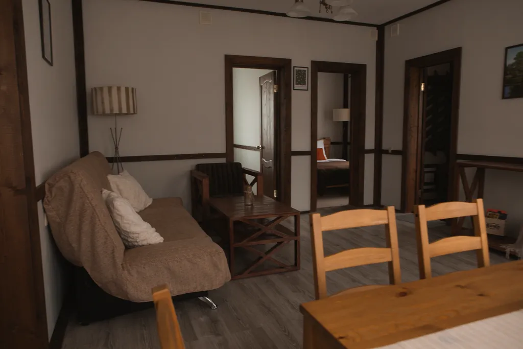 Дом может максимально принять 6 человек. 4 основных места и 2 дополнительных (раскладной диван в гостиной). Количество спален — 2.