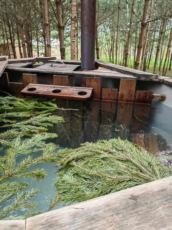 Японская баня фурако - купель с подогревом дровяным под открытым небом в сосновом лесу и вокруг никого. Можно добавлять в купель банные веники для аромата, еловые ветки, нарезанные грейпфрут или апельсины.