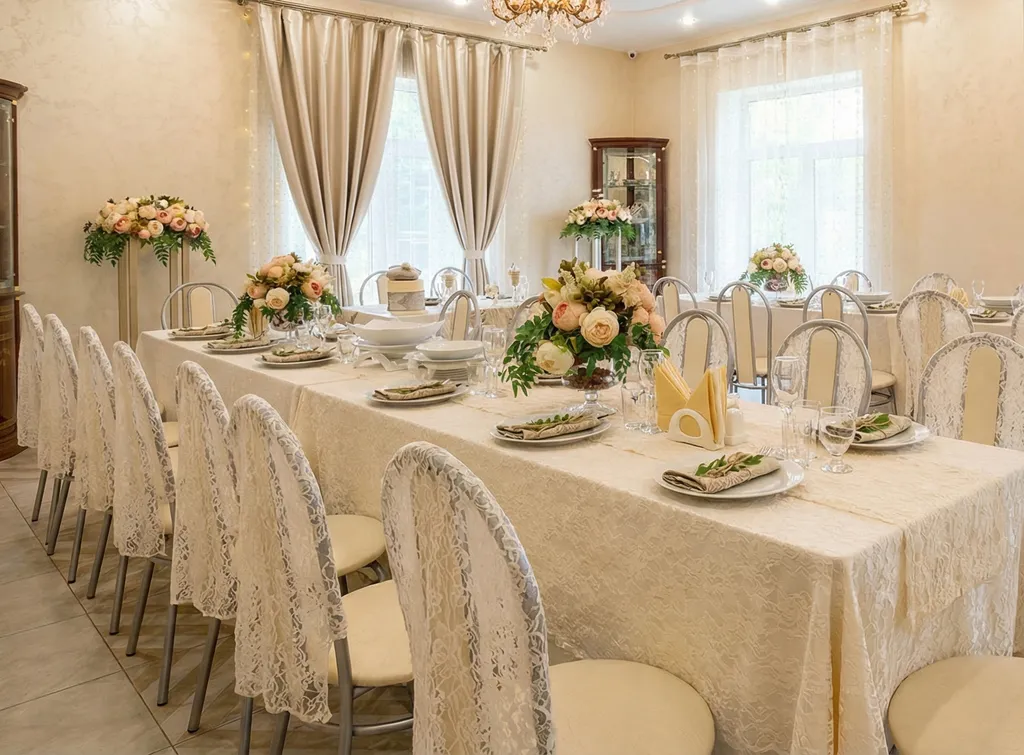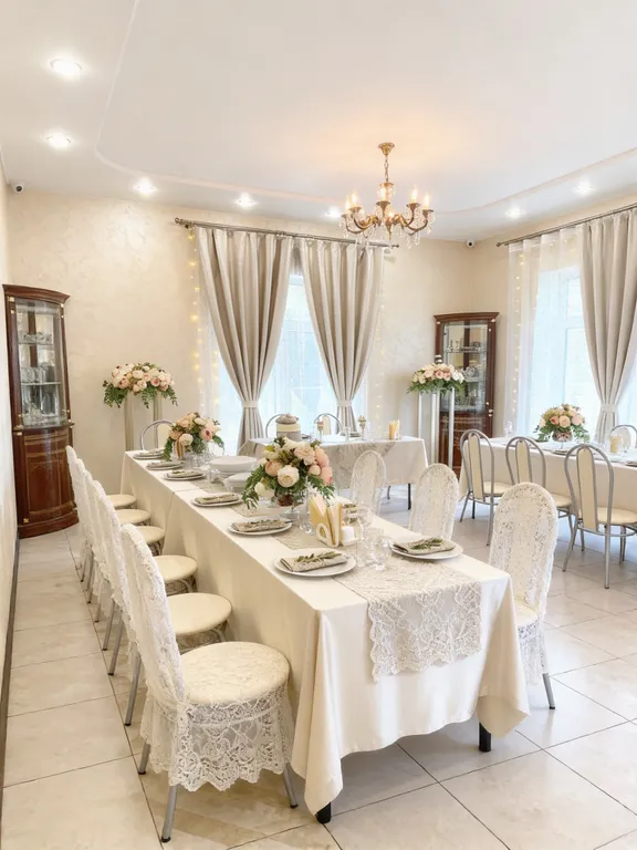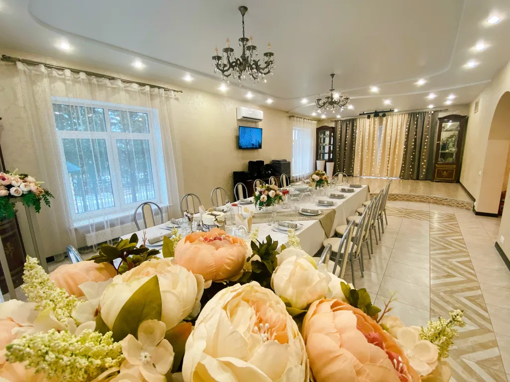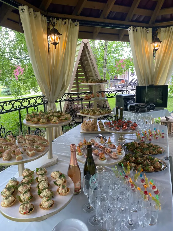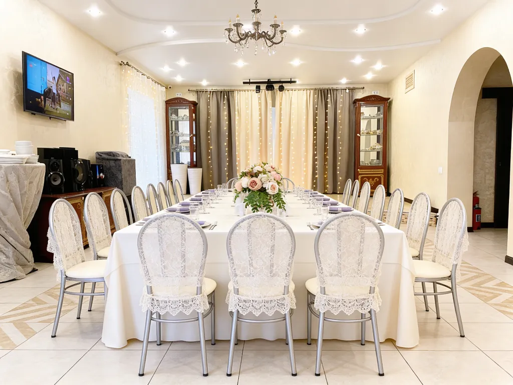 Декор зала, всё для банкета (текстиль, банкетная белая посуда), повар, официанты, фуршет, баня, банный чан, летний бассейн, кейтеринг, завтраки, доплата за животных.