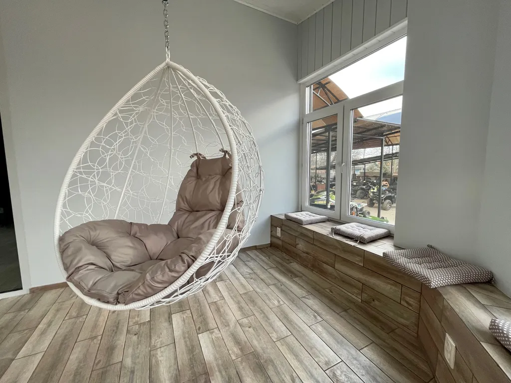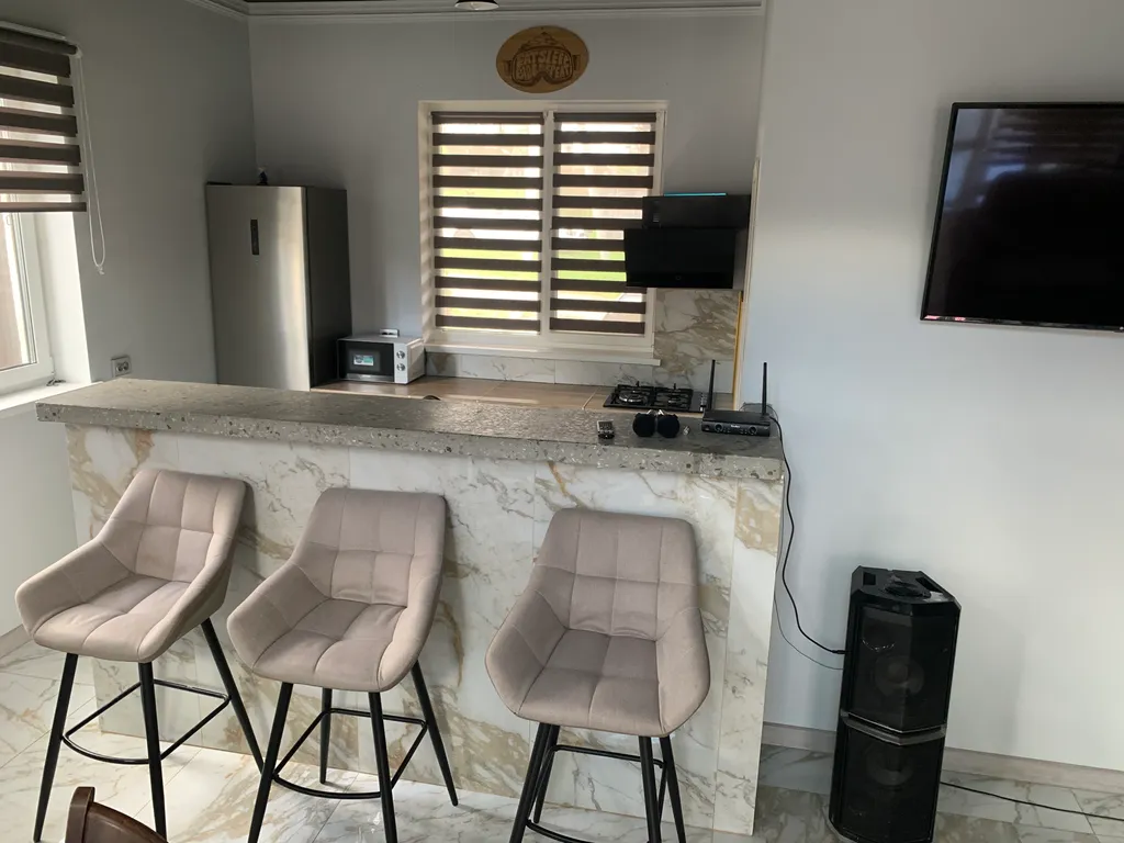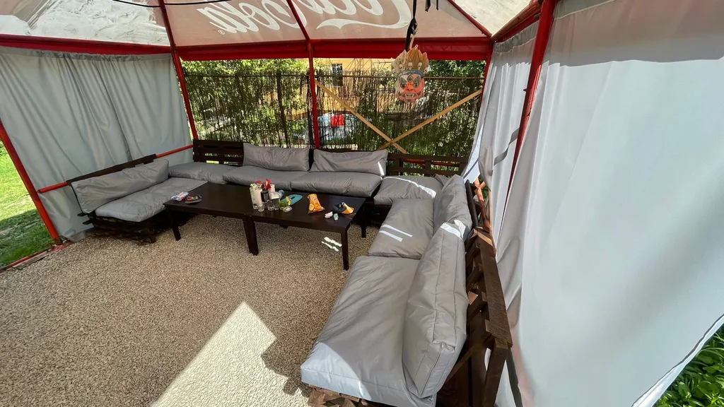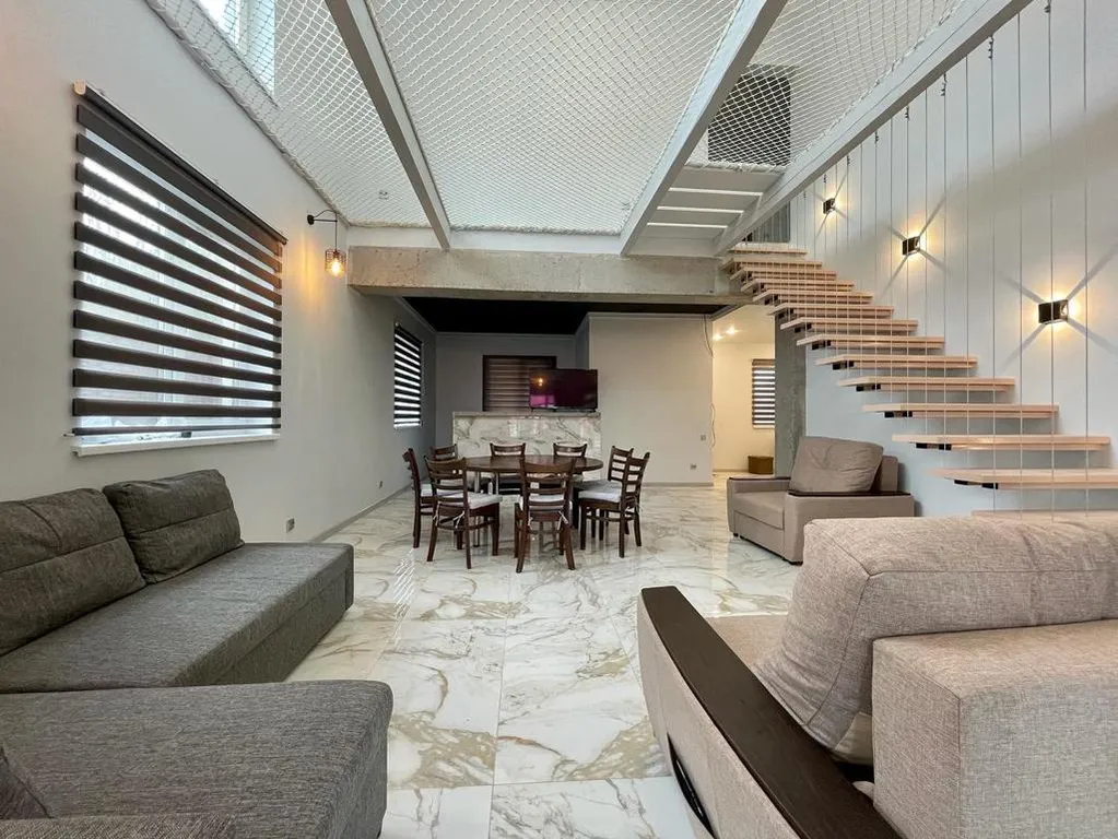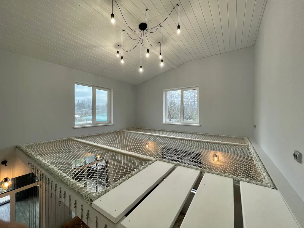 В доме 5 комнат, 3 санузла, кухня с баром, обеденная зона, чилаут-терраса с подвесными качелями, настольным футболом и аэрохокеем, огромный гамак 20м2, фото зоны, караоке, кальян, беседка с огромным диваном, мангальная зона с казаном, костровая чаша.