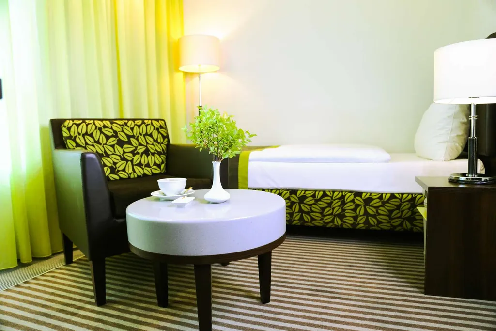 Отличная звукоизоляция. Оформление в пастельных тонах и большие панорамные окна. При желании можно выбрать номер с балконом и видом во внутренний двор с зеленой лужайкой, сообщив об этом при бронировании. Бесплатная парковка.