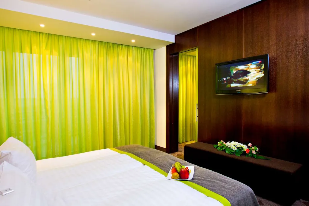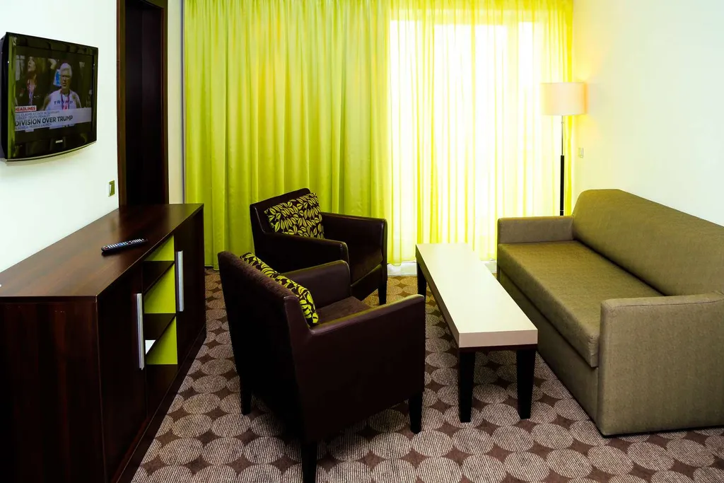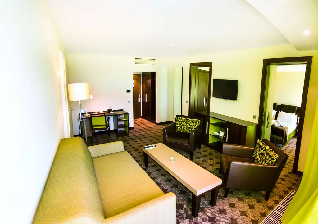 В номере: двуспальная кровать (180х200 мм), раскладной диван, ковровое покрытие, гостиный уголок с ЖК-ТВ (32 дюйма, 40 каналов, включая спутниковые), Wi-Fi, письменный стол, кондиционер, гардероб, сейф, мини-бар, ванная комната с гидромассажной ванной, халатом и тапочками, туалет, проводной интернет, телефон и др.