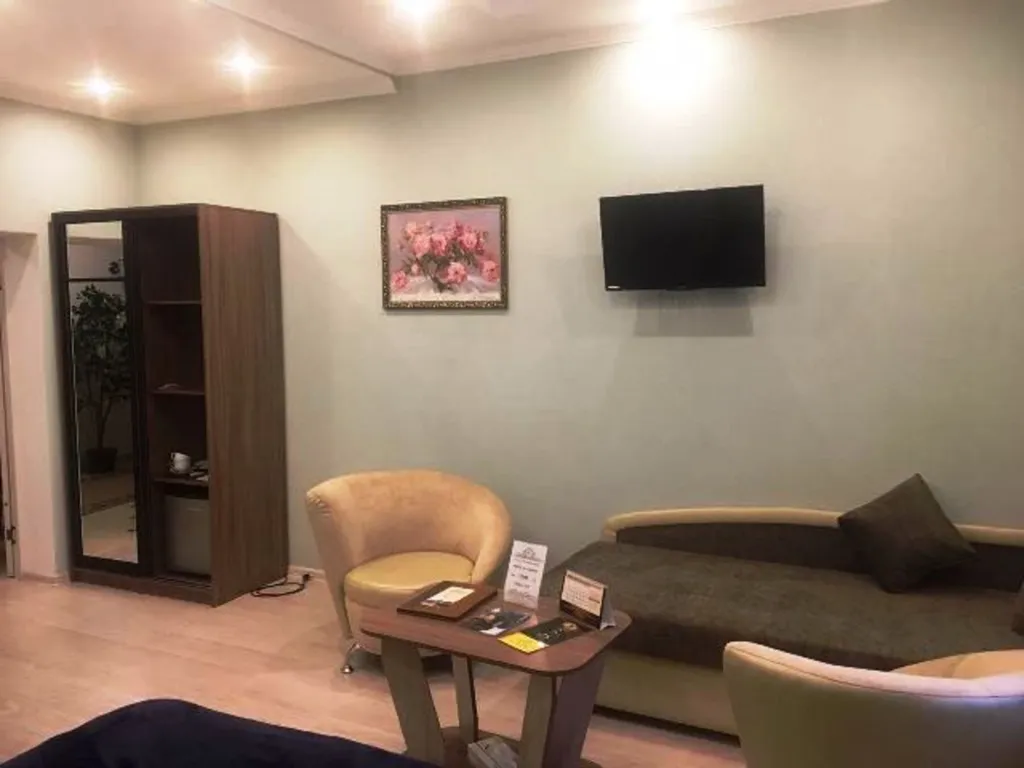 В ванной: душевая кабина, туалет, раковина, средства личной гигиены, набор полотенец. Мини-бар, фен — платные.