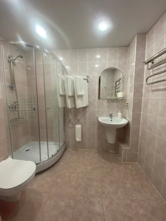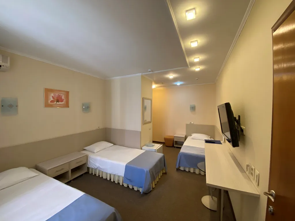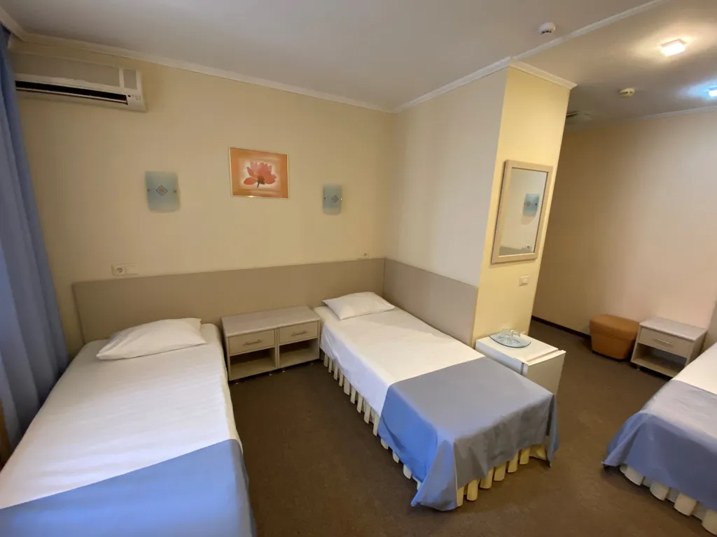 Трехместный однокомнатный номер. Три 1-спальные кровати или одна 2-спальная кровать и одна 1-спальная кровать. С/у с душевой кабиной, мини-холодильник, кондиционер, телевизор, телефон, фен, полотенцесушитель электрический