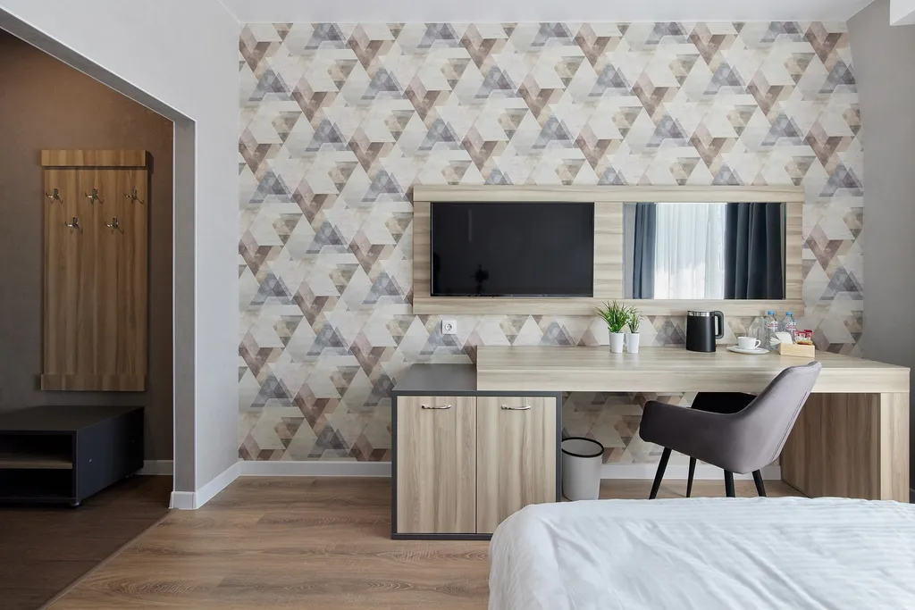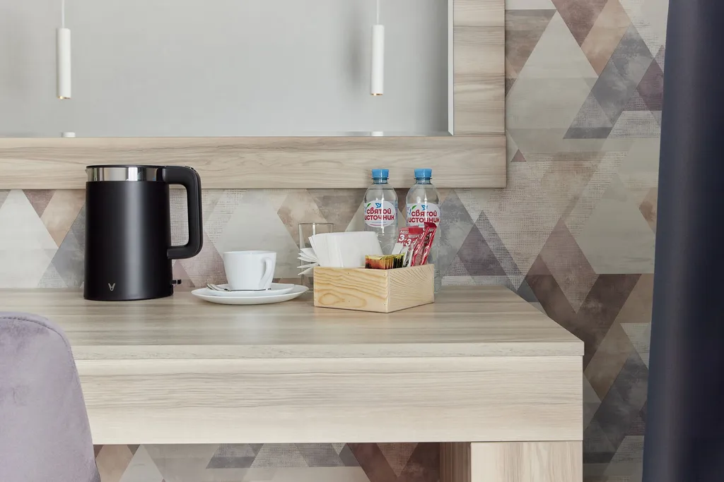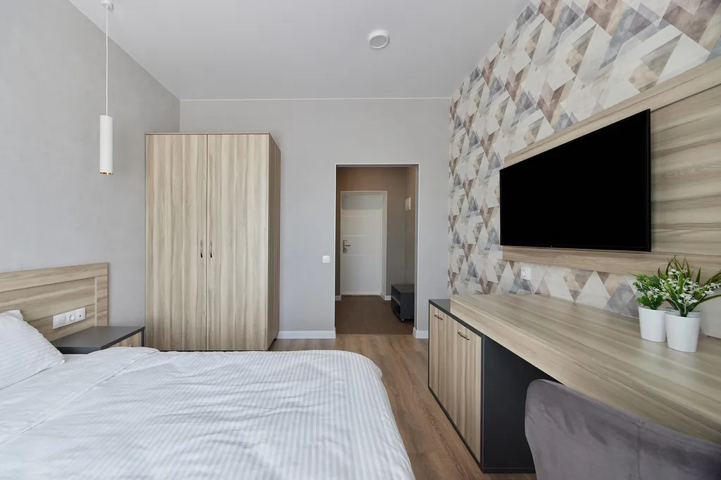 Имеется телевизор, кондиционер, отопление, шкаф, вешалка, стол обеденный и рабочий, холодильник, стулья, корзина для мусора, чайник.