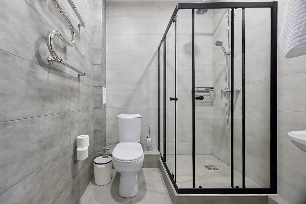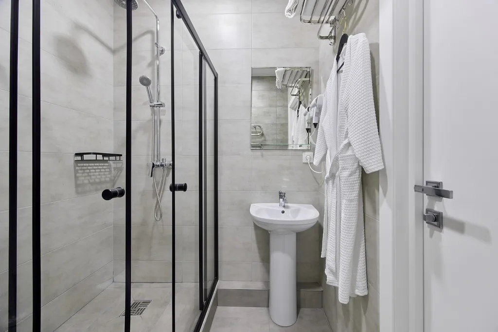 Индивидуальная ванная комната: душ, раковина, туалет.