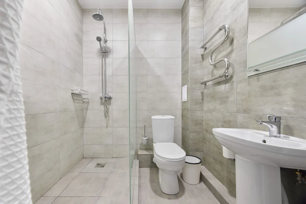 Индивидуальная ванная комната: душ, раковина, туалет.