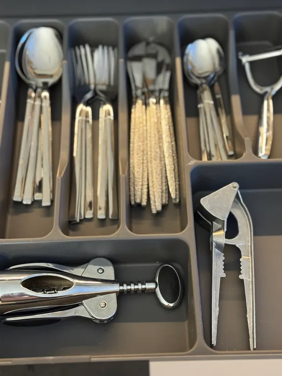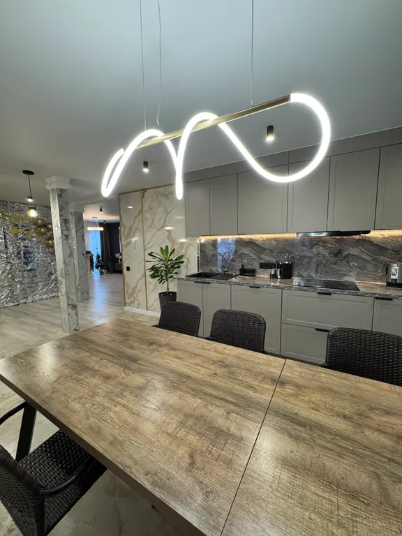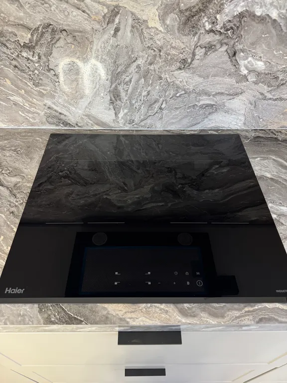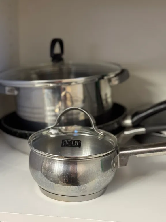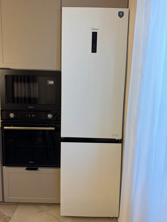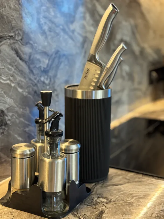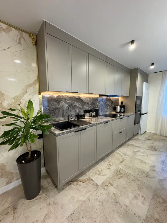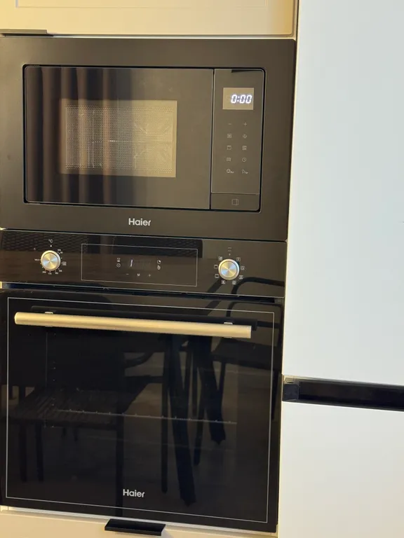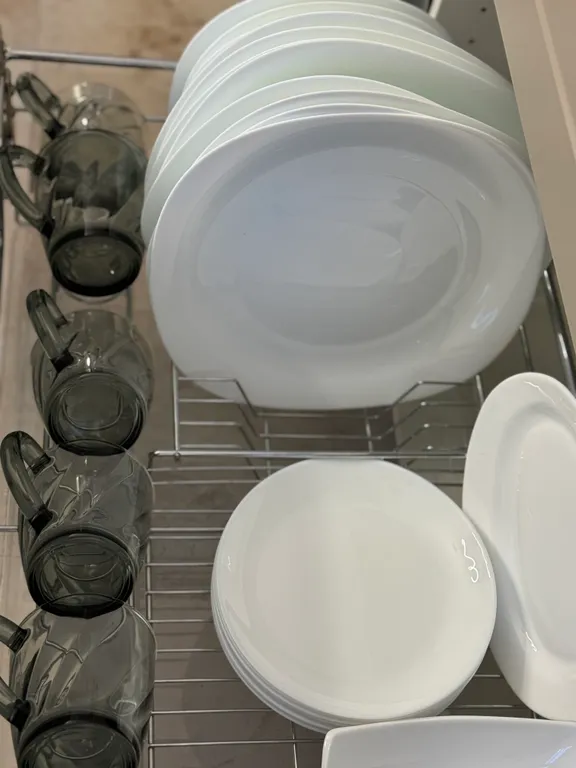 Кухню с необходимой посудой, микроволновой печью, духовкой, холодильником, чайником и посудомоечной машиной.
