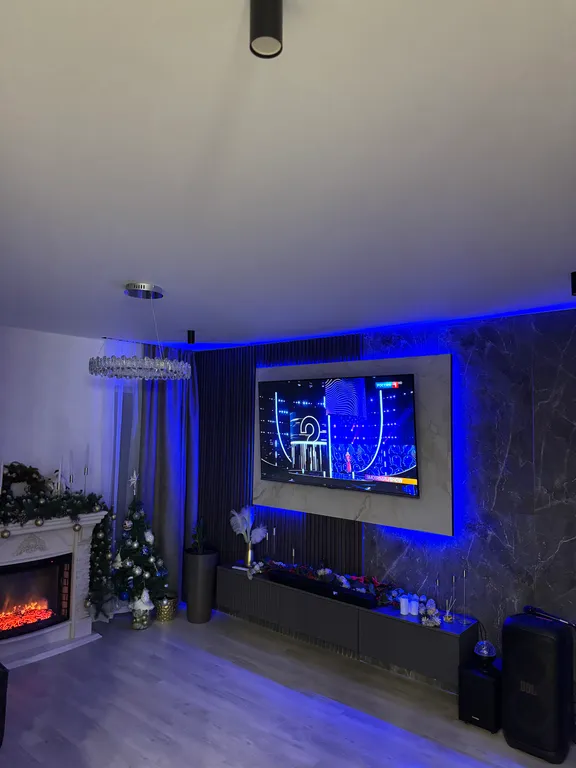 Гостиную: просторная, светлая гостиная с камином, с tv зоной с домашним кинотеатром, с jbl колонкой и караоке.