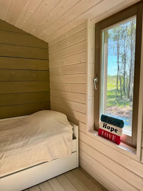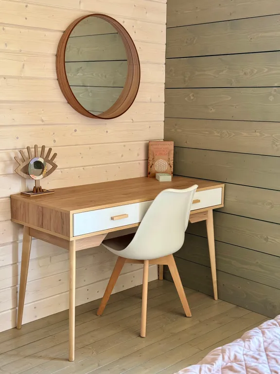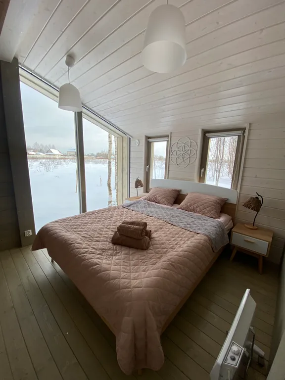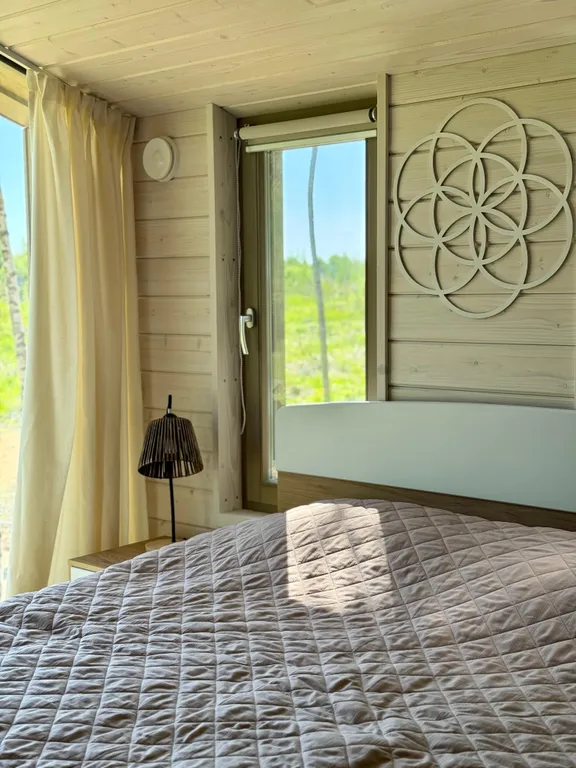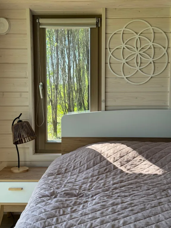 Спальня "цветок жизни": большая двуспальная кровать, вместительный шкаф, письменный стол и потрясающий вид на лес и восход — прямо из кровати
