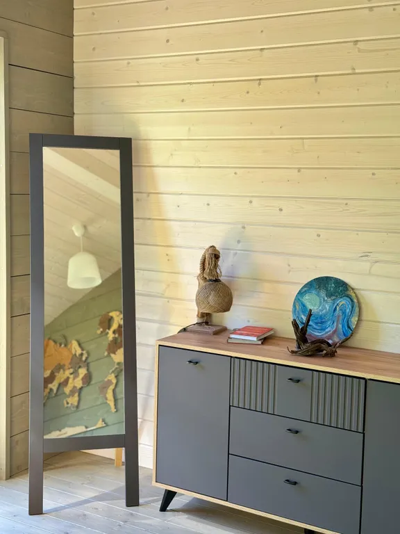 Спальня "лофт": бархатный диван-кровать, зеркало в пол, тумба для одежды, мягкая подсветка с картой мира; место идеально подходит для чтения, занятий спортом или йоги (в наличии коврики и инвентарь)