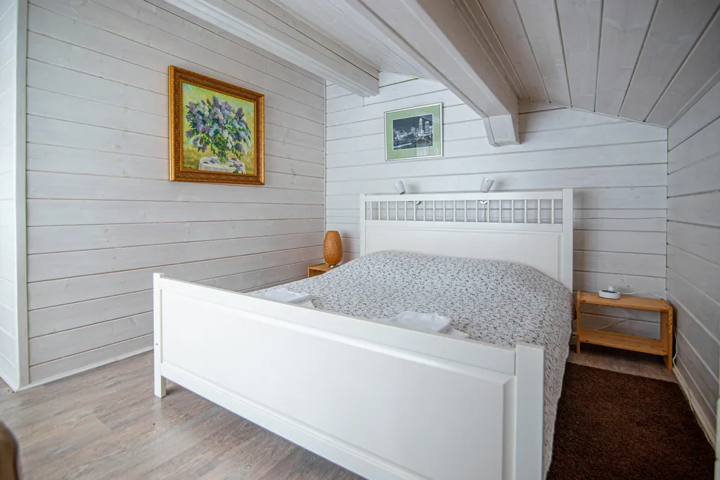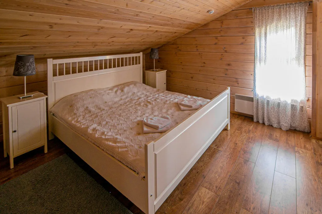 на 2 этаже в каждой спальне - две односпальных или одна двуспальная кровать (180*200), а также возможна установка раскладной кровати в спальнях на 2 этаже