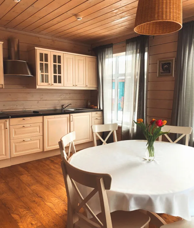 Трехкомнатный коттедж с сауной и зоной BBQ в Голицыно из профилированного бруса в финской деревне. Просторная гостиная с уютными диванами и ТВ, 3 отдельные спальни, 2 ванные комнаты, финская сауна, большая кухня с обеденной зоной, оборудованная всем необходимым. Просторная терраса 25 кв. м с уличной мебелью и качелями, зоной BBQ.