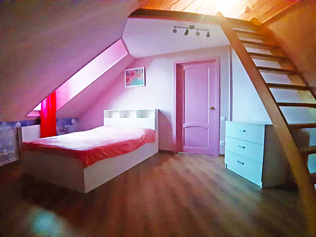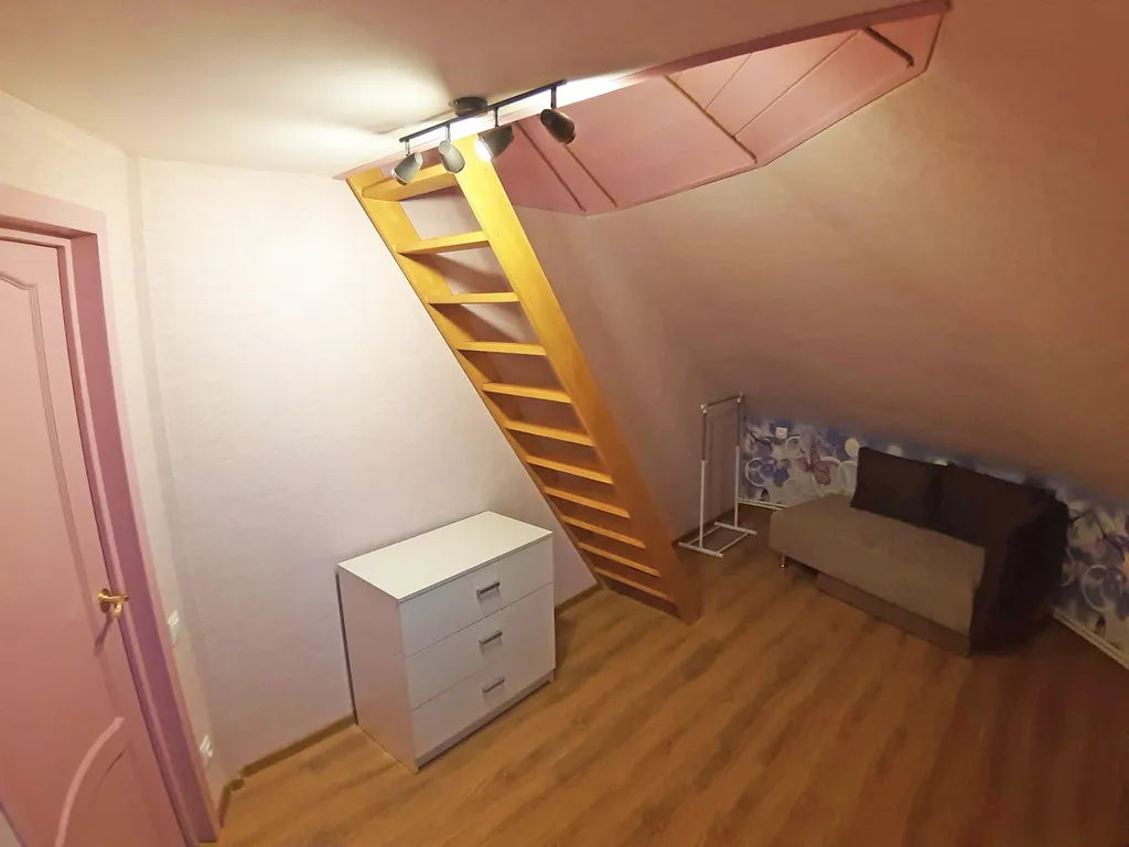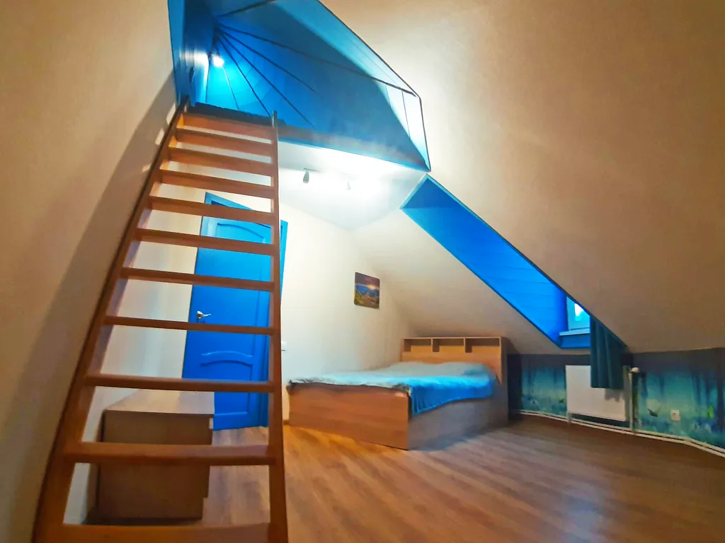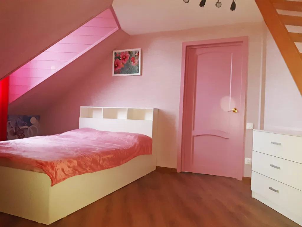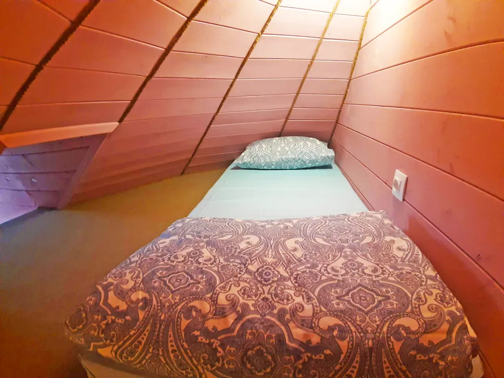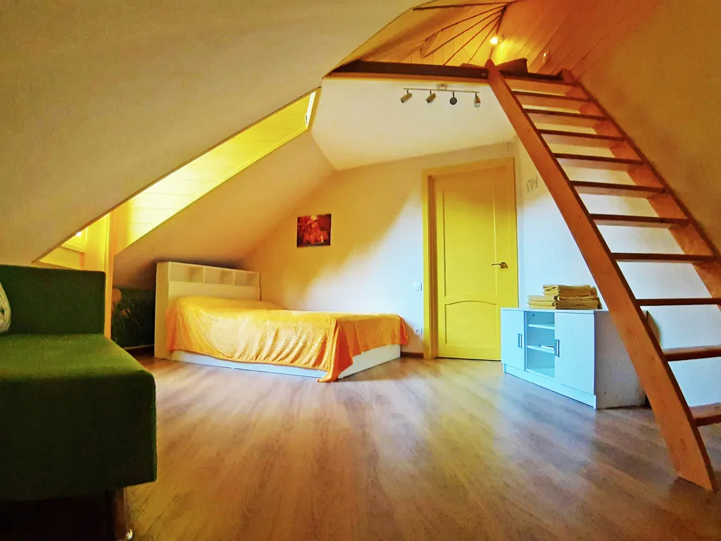 На втором этаже: 2 спальни, в каждой их них: двуспальная кровать, односпальный диван и односпальный матрас на чердачке