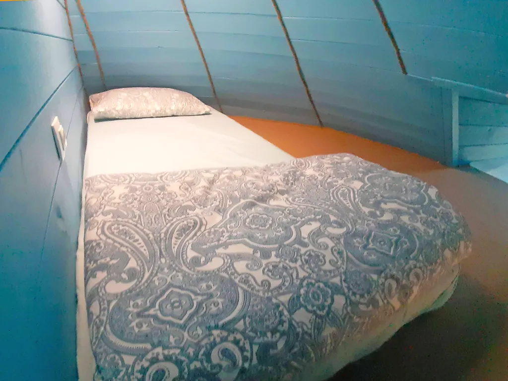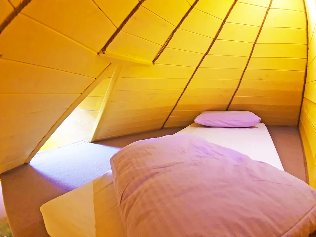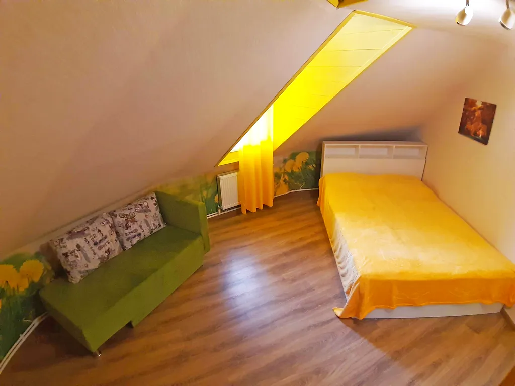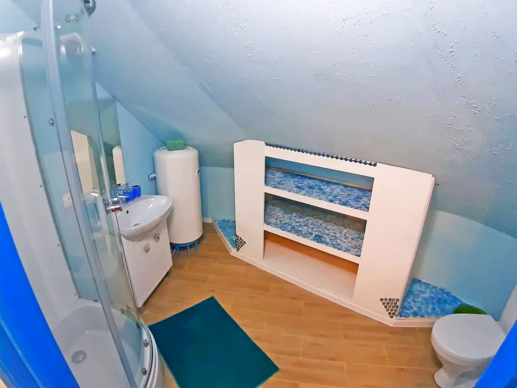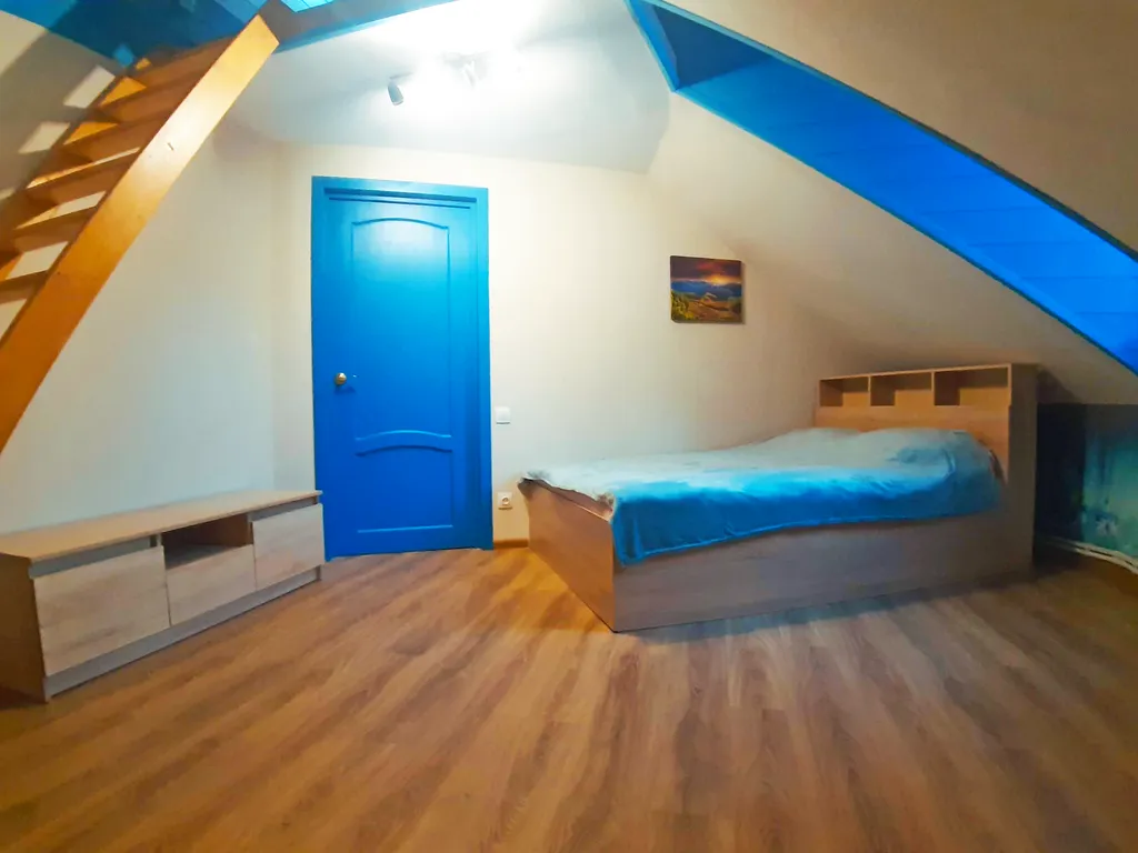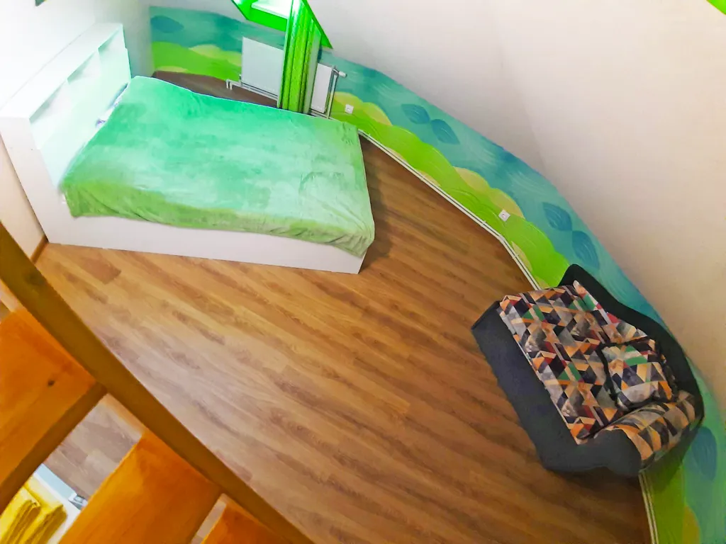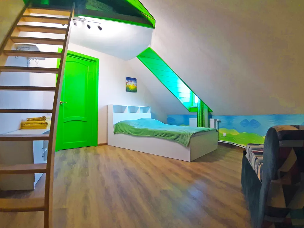 На втором этаже: 2 спальни, в каждой их них: двуспальная кровать, односпальный диван и односпальный матрас на чердачке