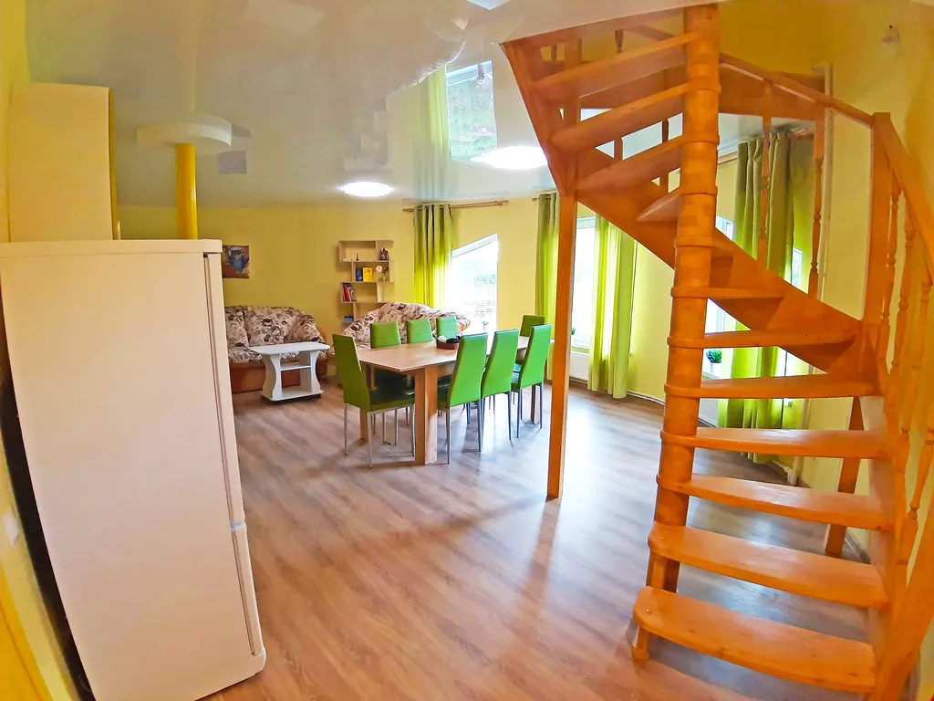 На первом этаже: 1 спальня с двуспальной кроватью и односпальным диваном и кухня-гостиная с двумя двуспальными диванами