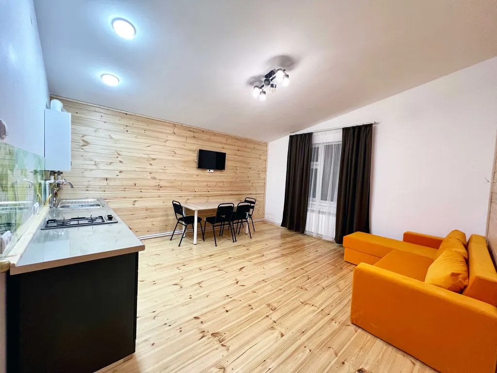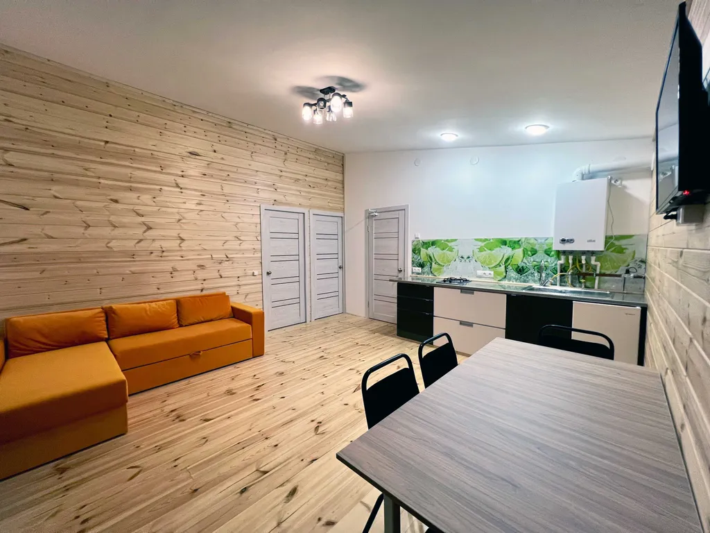 В доме chalet обеденная и гостиная зоны объединены с кухонным уголком.