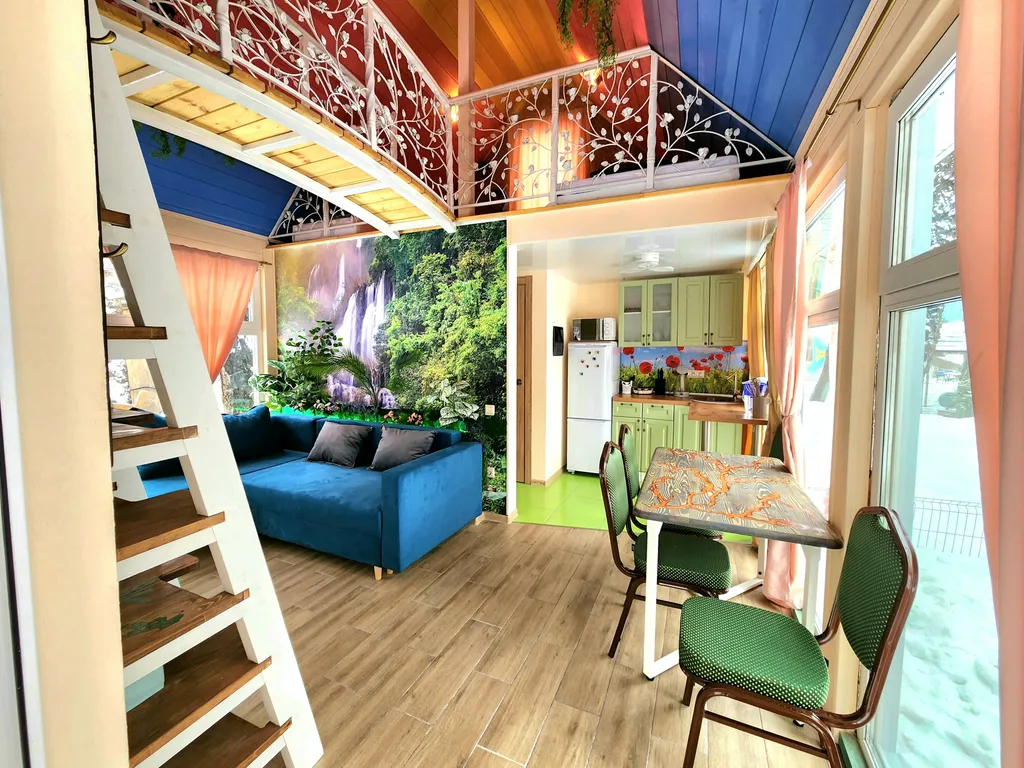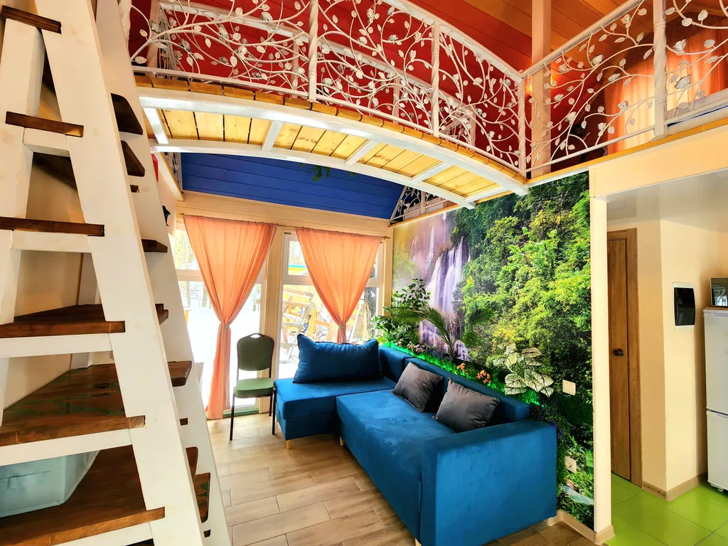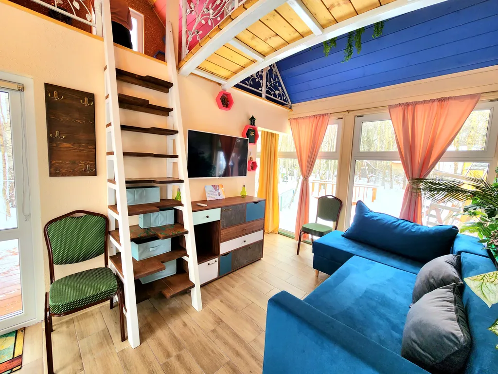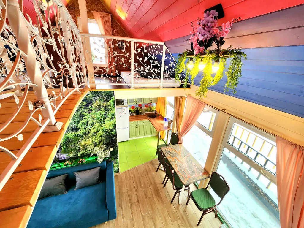 А наш домик феи - это двухуровневые апартаменты с большими панорамными окнами с видом на березовую рощу. Его интерьеры выполнены в светлых и ярких тонах с цветочными украшениями, а рядом с домом обустроено место для приготовления барбекю. Такой домик идеально подойдет для семьи с детьми или влюбленной пары!