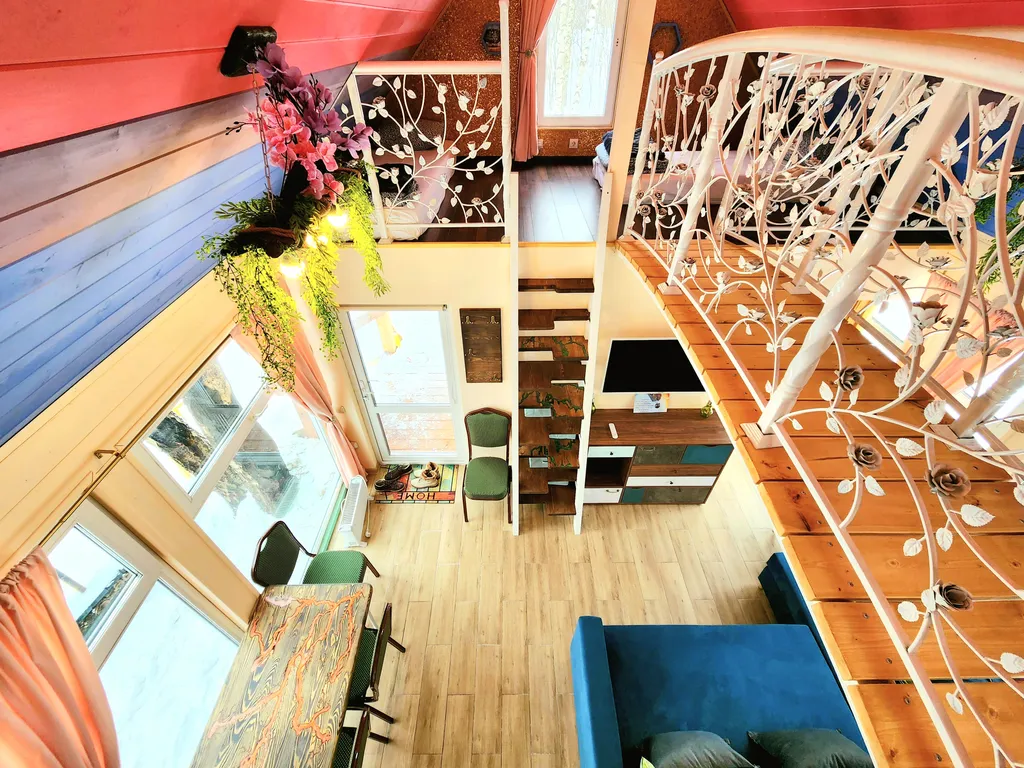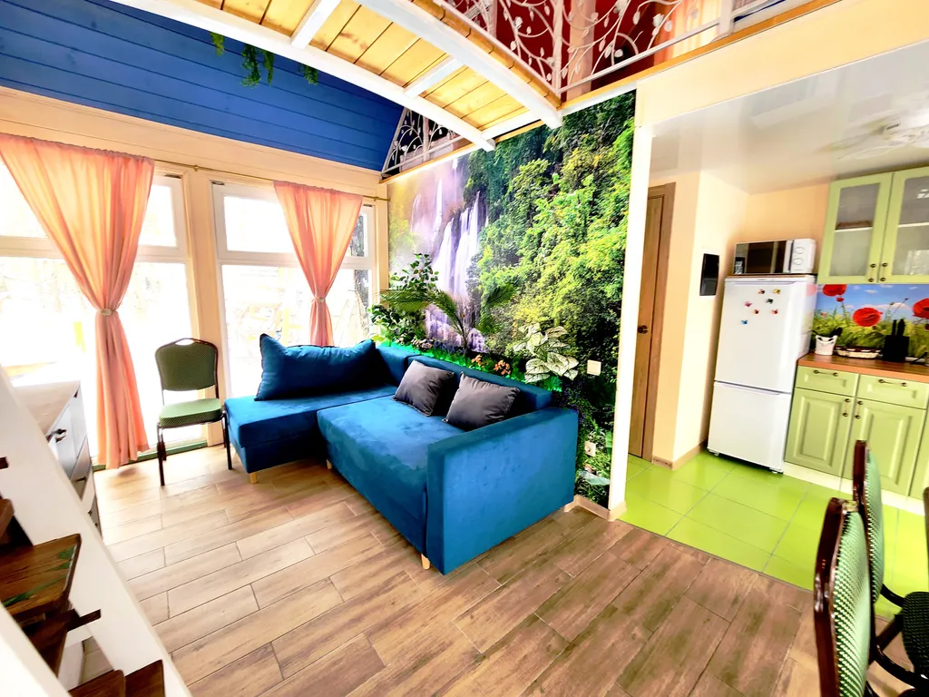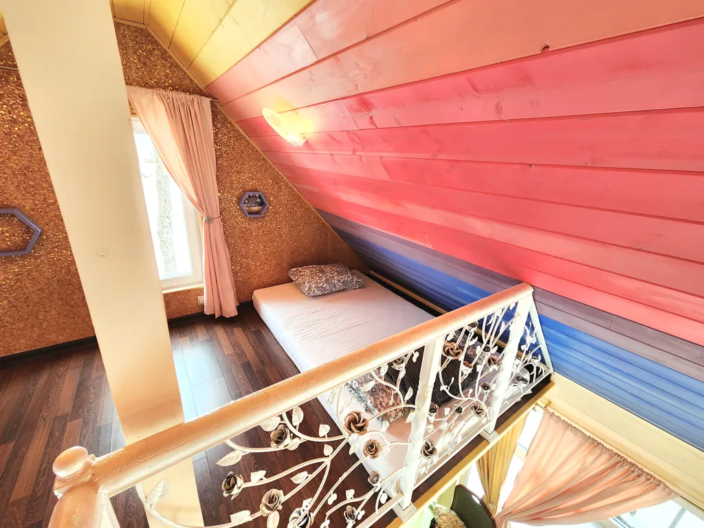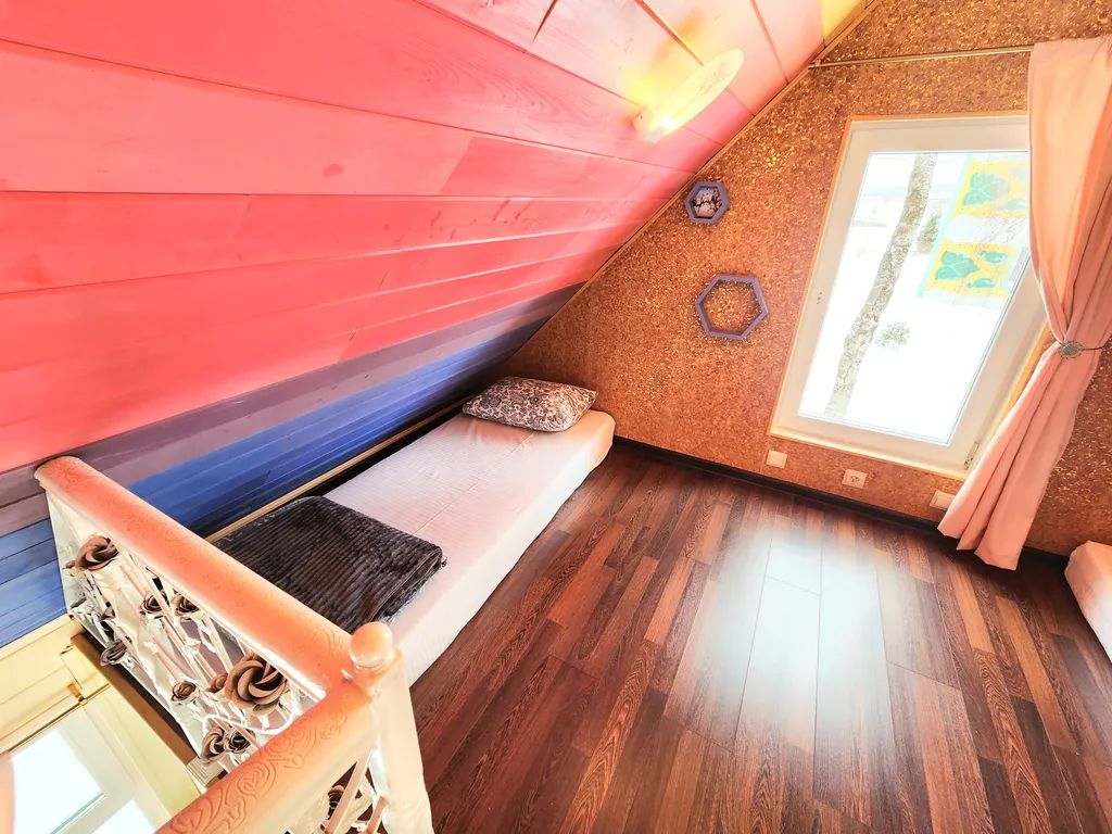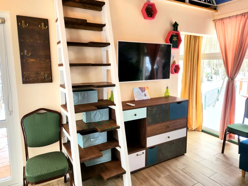 А наш домик феи - это двухуровневые апартаменты с большими панорамными окнами с видом на березовую рощу. Его интерьеры выполнены в светлых и ярких тонах с цветочными украшениями, а рядом с домом обустроено место для приготовления барбекю. Такой домик идеально подойдет для семьи с детьми или влюбленной пары!